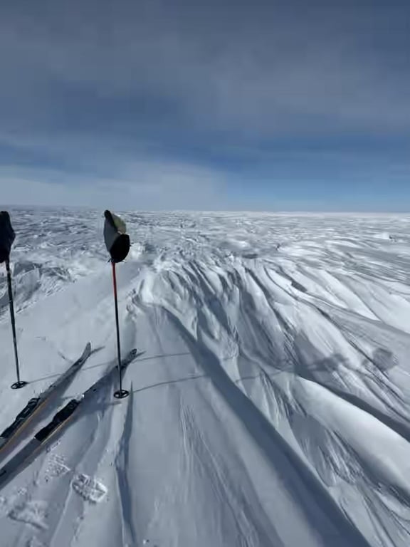 By Day 30, the landscape became a mix of hills and sastrugi. Weather conditions were more favourable, and Ian noted that he now had less than 300 km remaining to the South Pole. However, cloudy forecasts and flat light continued to threaten slower progress in the days ahead.